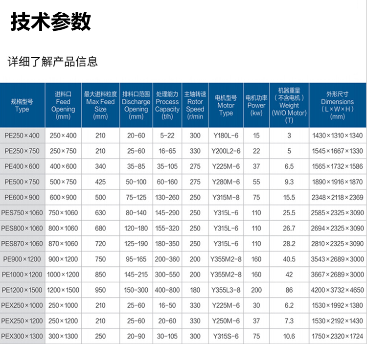 破碎機按其外形規格尺寸及時產量高低的不同,常可劃分出很多規格型號,另外,為了滿足部分高要求客戶生產需求,市場現又推出了一類移動式鄂破機,鄂破機參數詳情如下表: